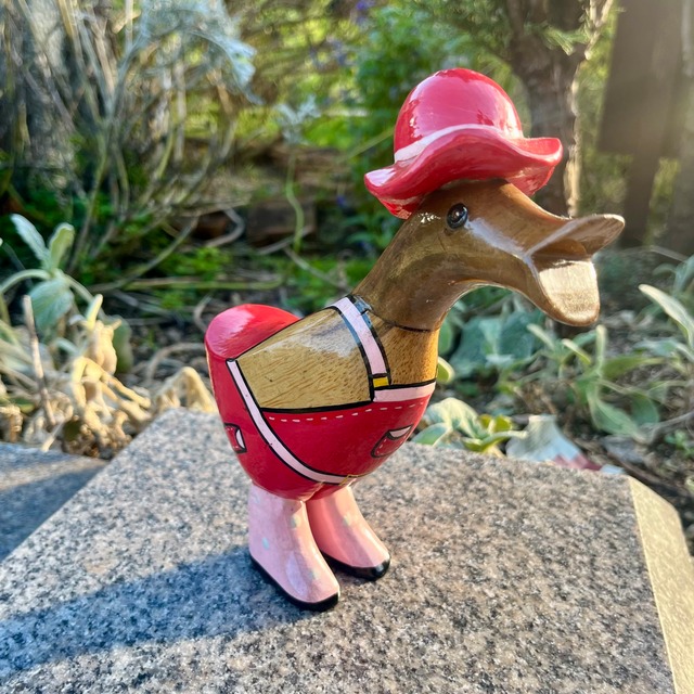 手作りのかわいい木彫りダック 帽子にブーツを着たおしゃれさん つぶらな瞳に癒されます◎ サイズ:(W) 約7.5cm × (D) 約16cm × (H) 約17.5cm