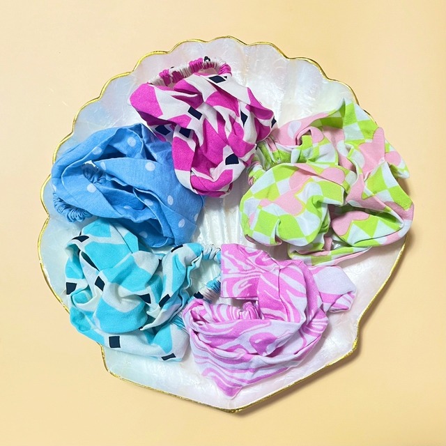 カラフルで目を引くデザインのシュシュ♪ 柔らかく伸縮性のある生地で作られているので、痛くなりにくく髪を優しくしっかりとまとめることができます。 8つのパターンの中から、あなたの個性や気分に合わせてお気に入りを見つけてください。