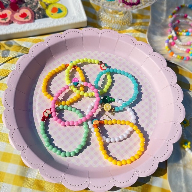 カラバリ豊かなビーズネックレス! ワンポイントのフルーツがかわいい♪ 推しカラーを、友達や親子でお揃いにしてもとってもかわいいアイテムです◎ サイズ:手首周り 約16cm