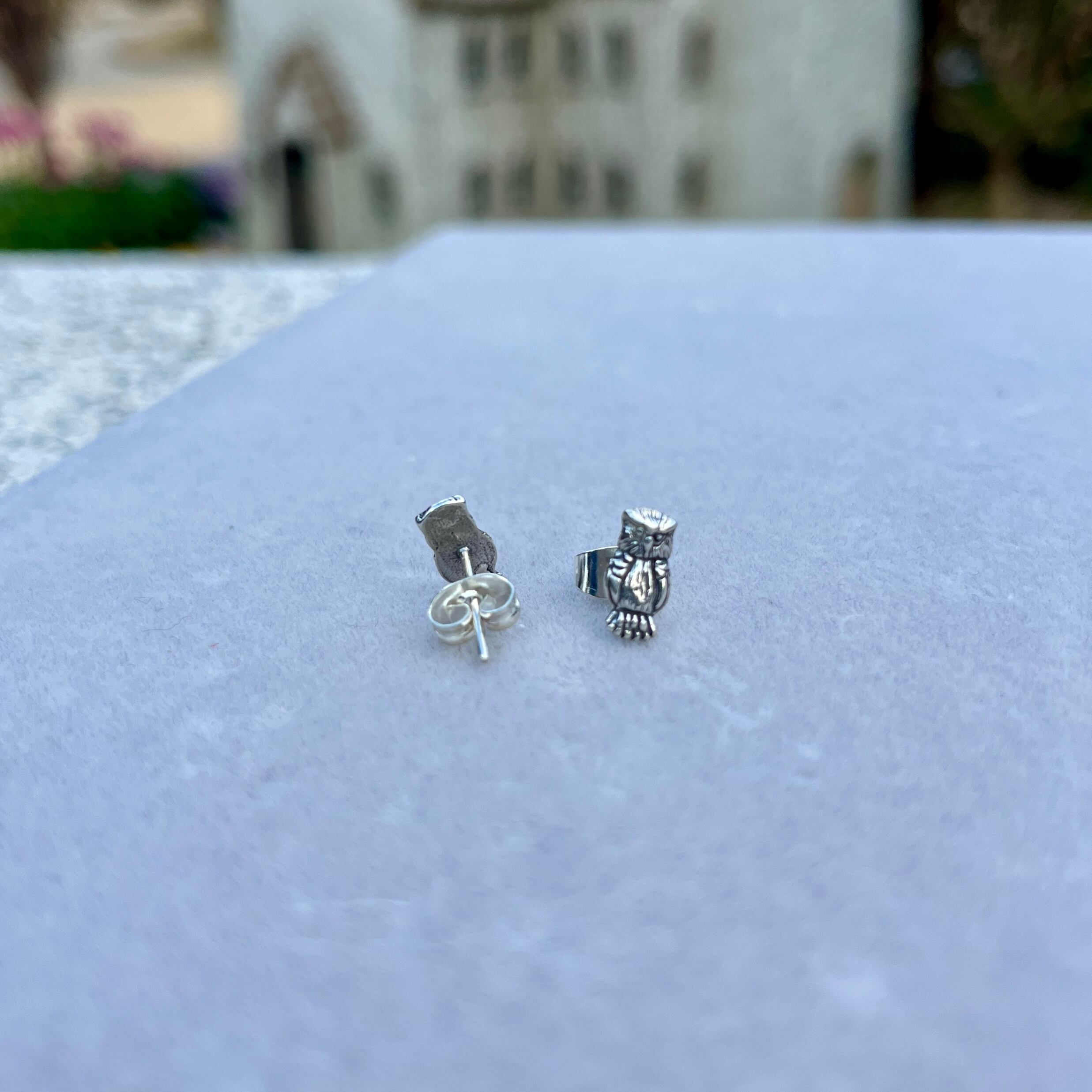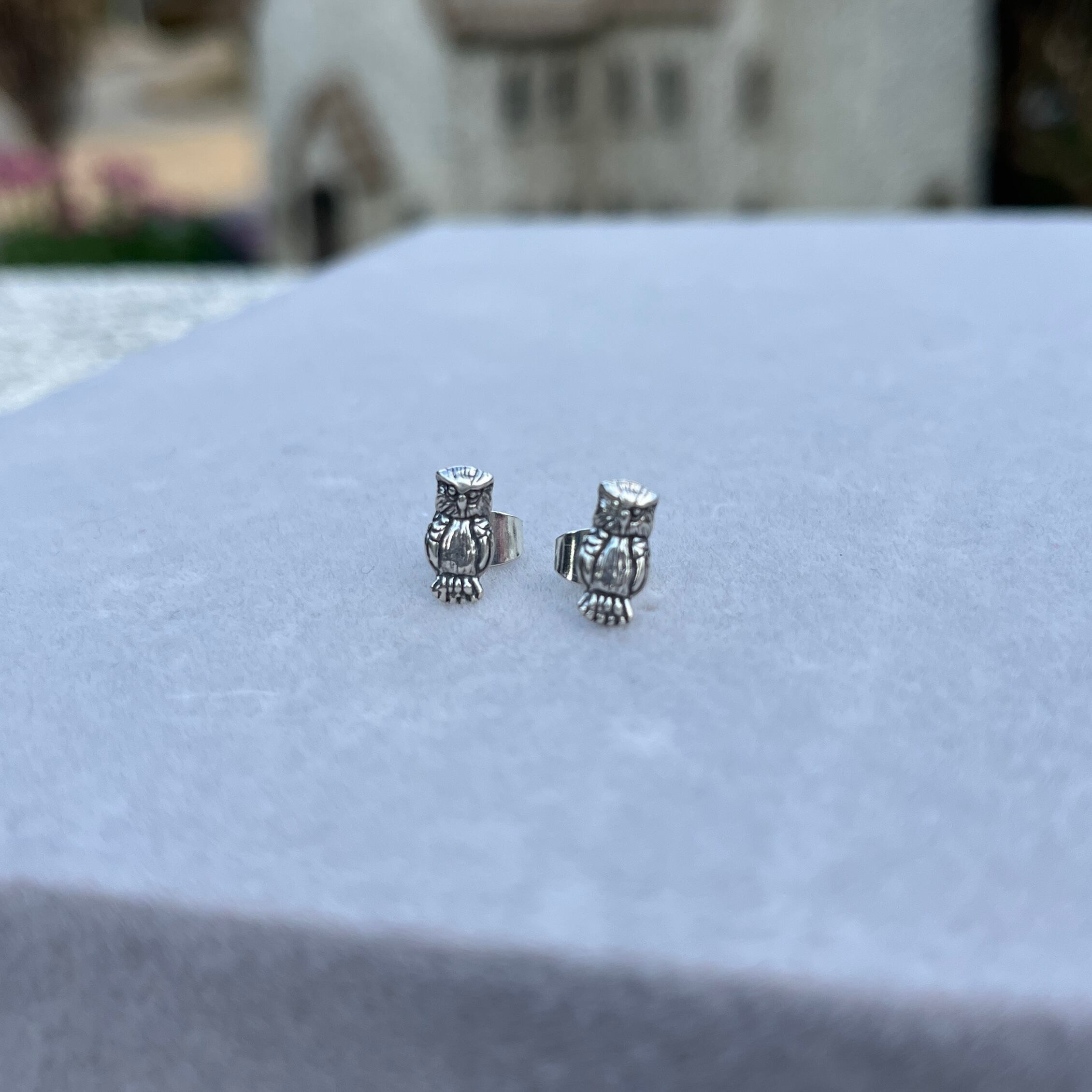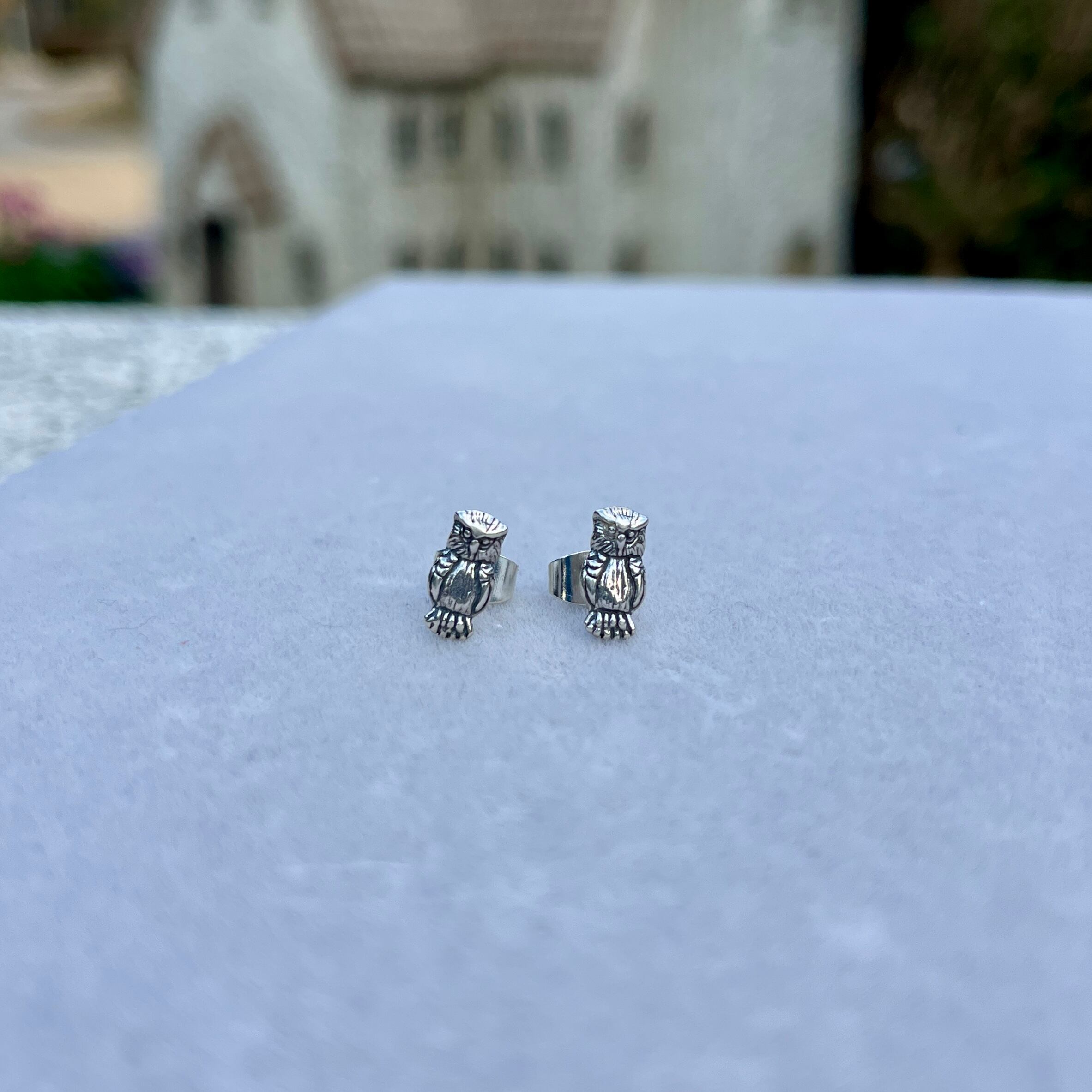繊細に彫られたフクロウデザインのピアス