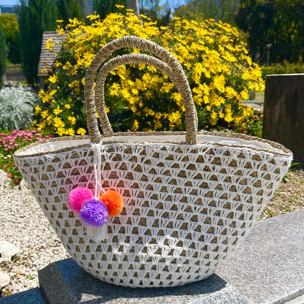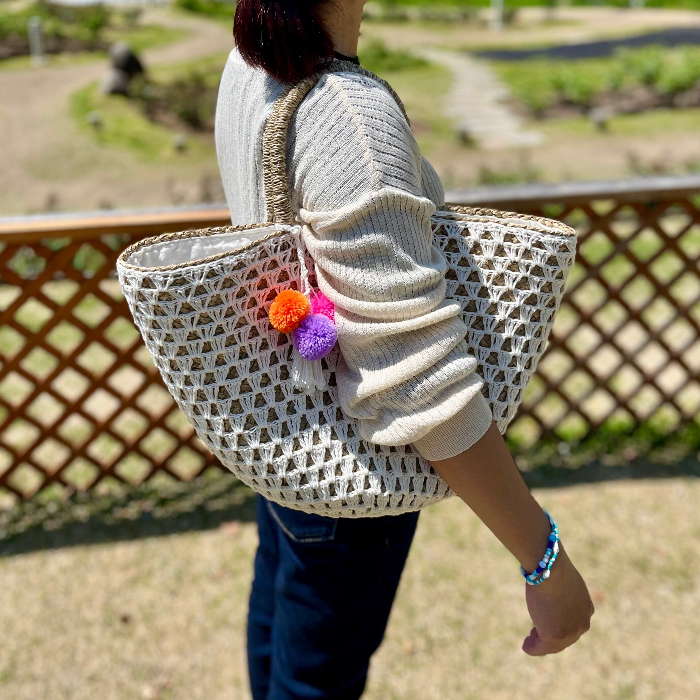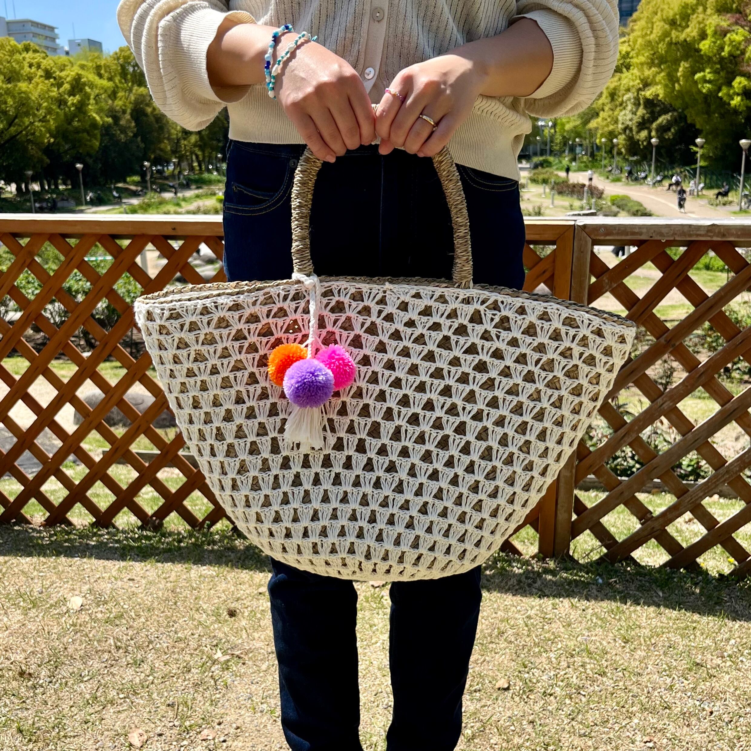 カゴ×ニットが特徴的な手編みバッグ