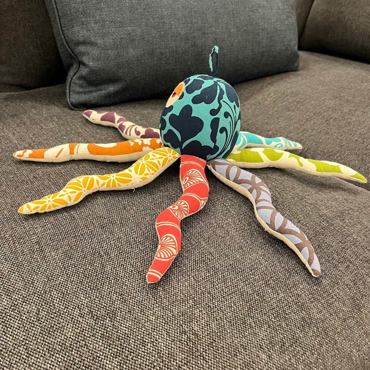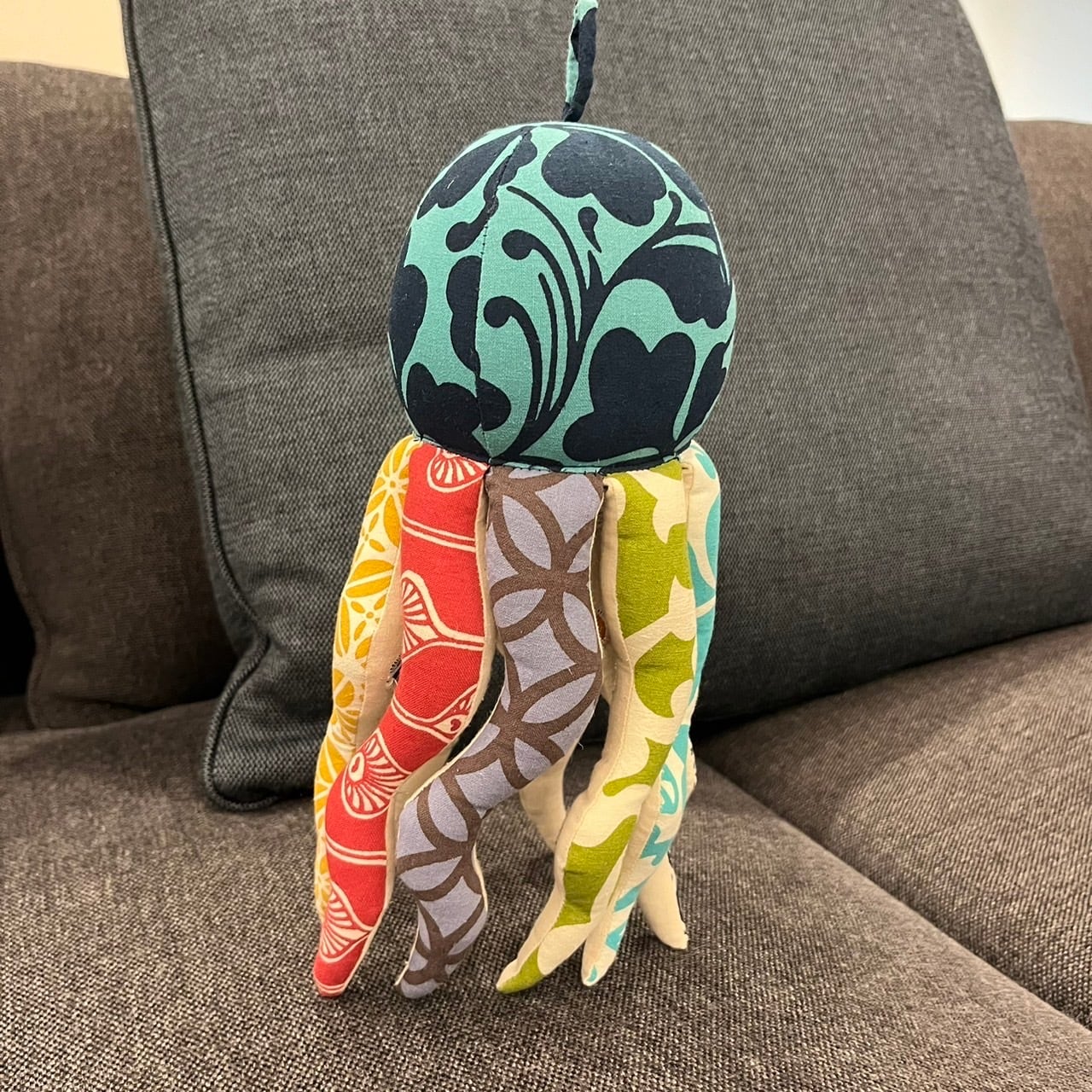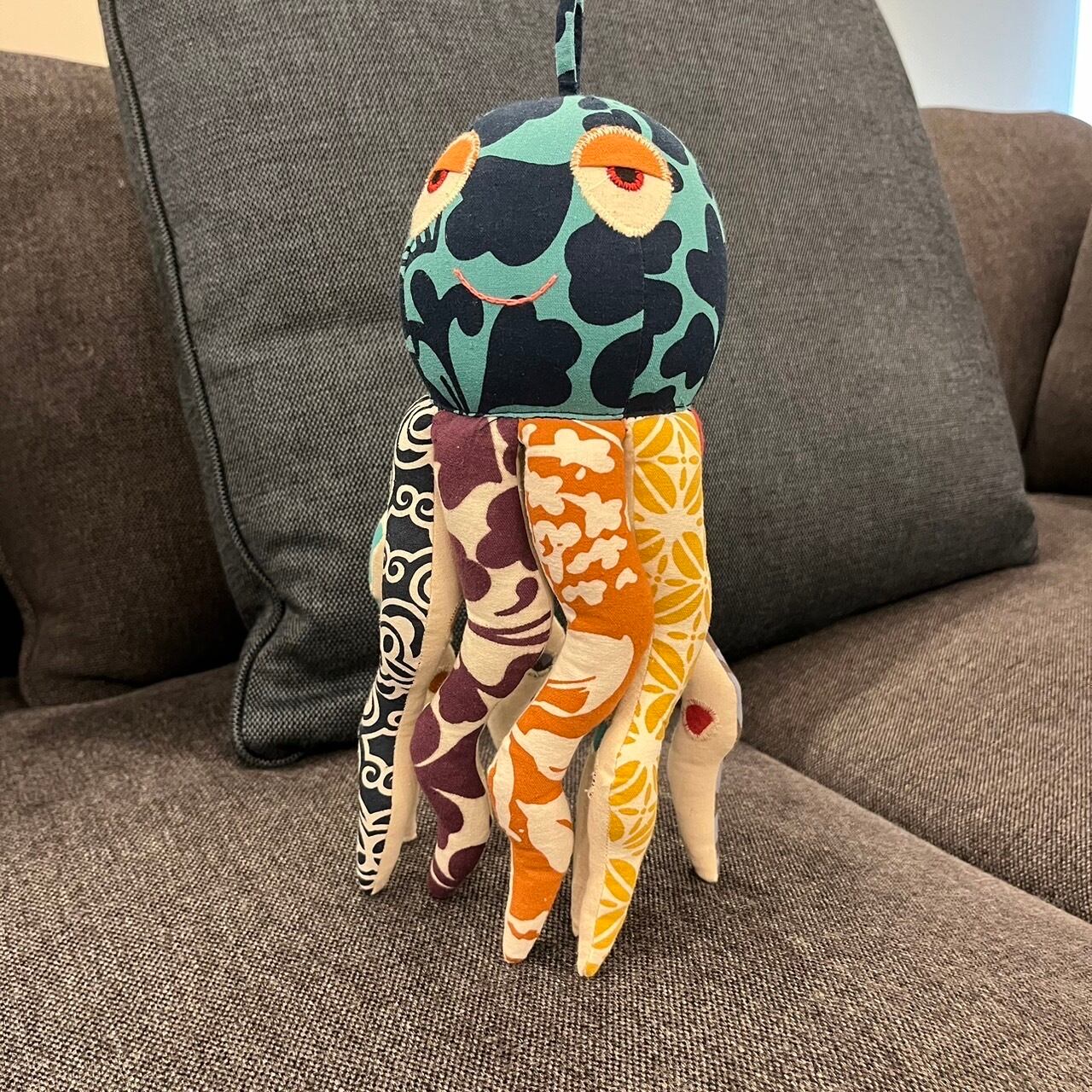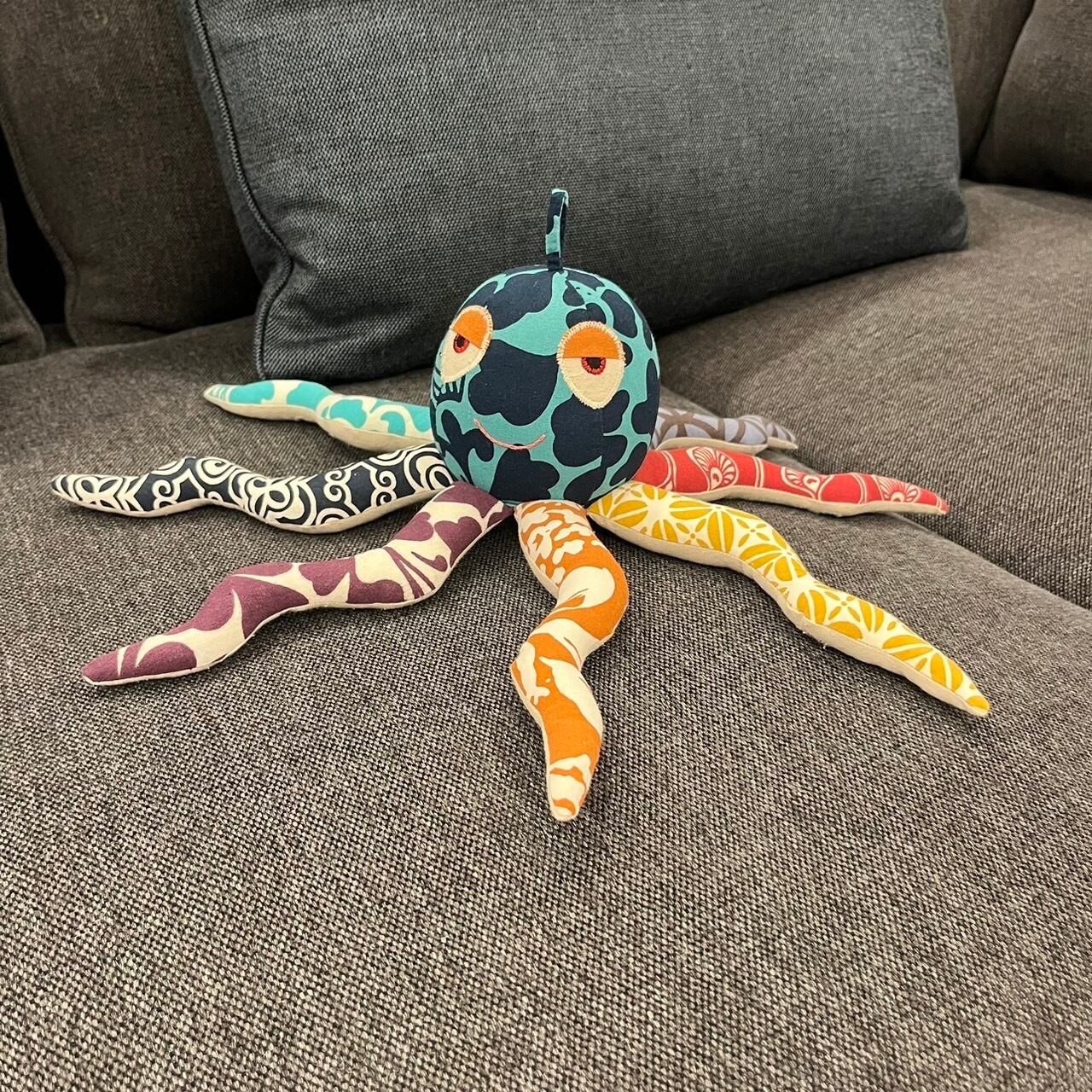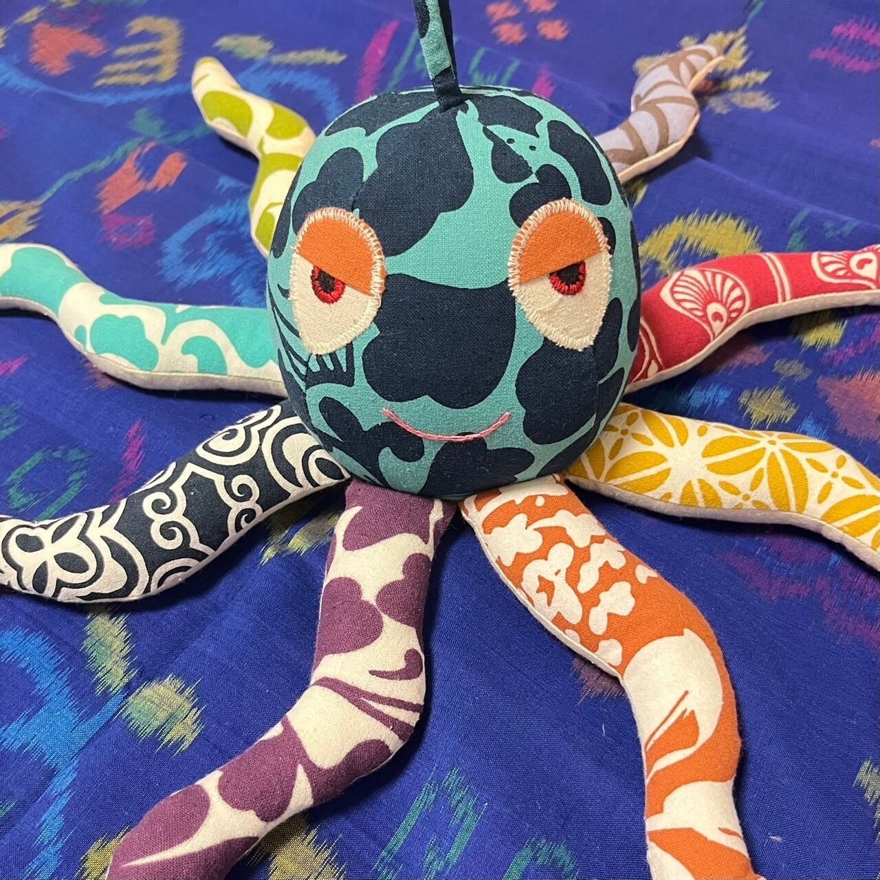 オリジナルの布で作られたパッチワークのぬいぐるみ。