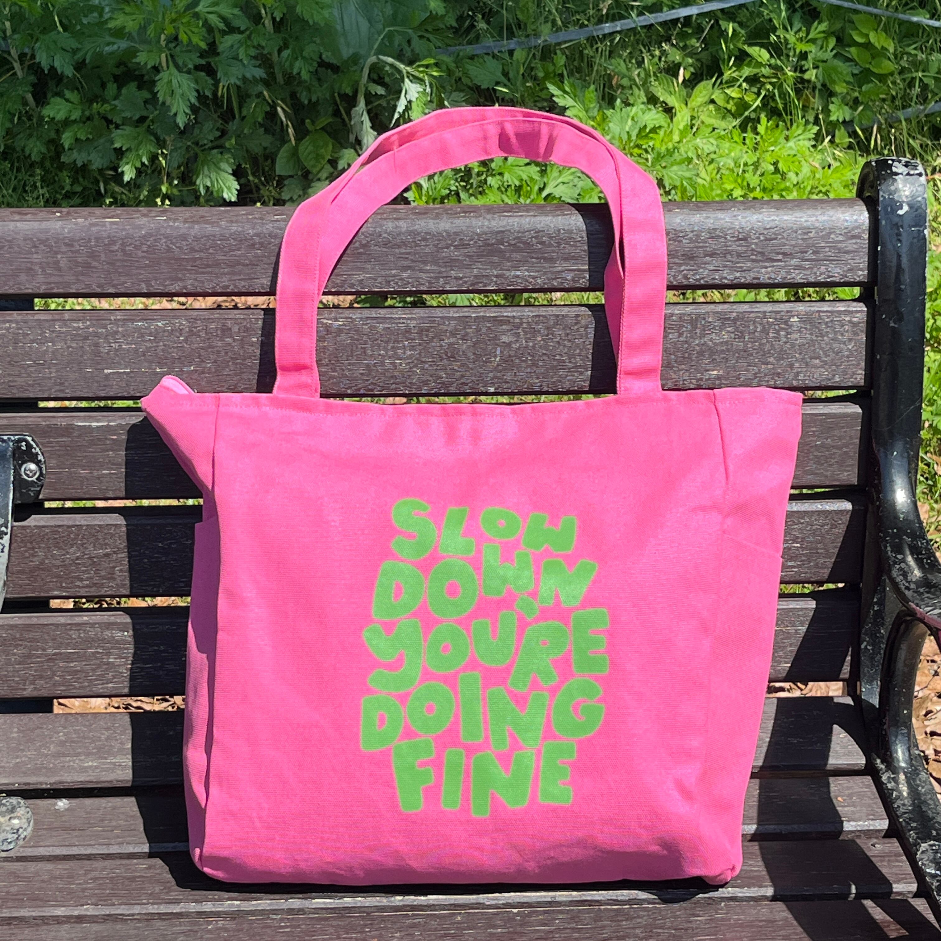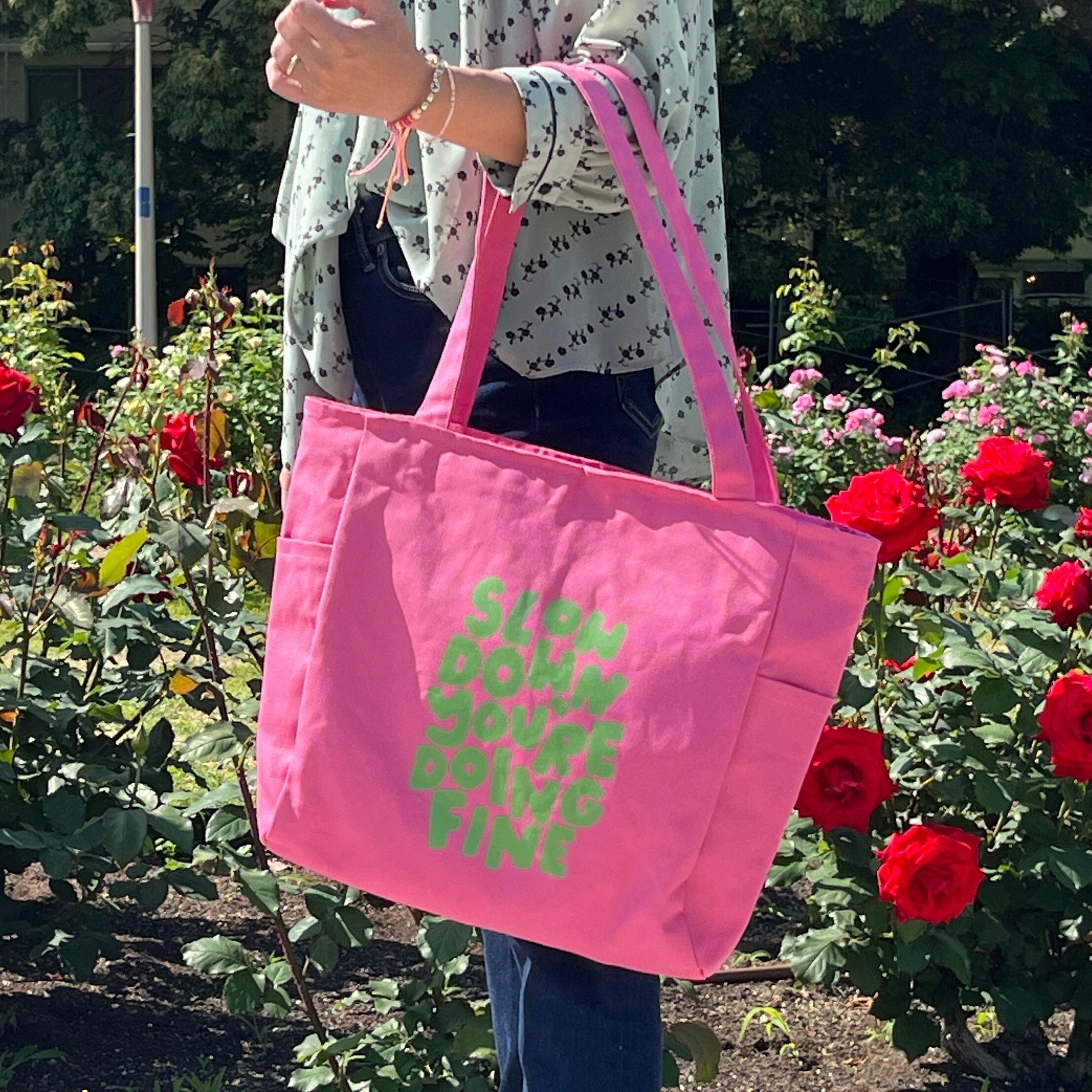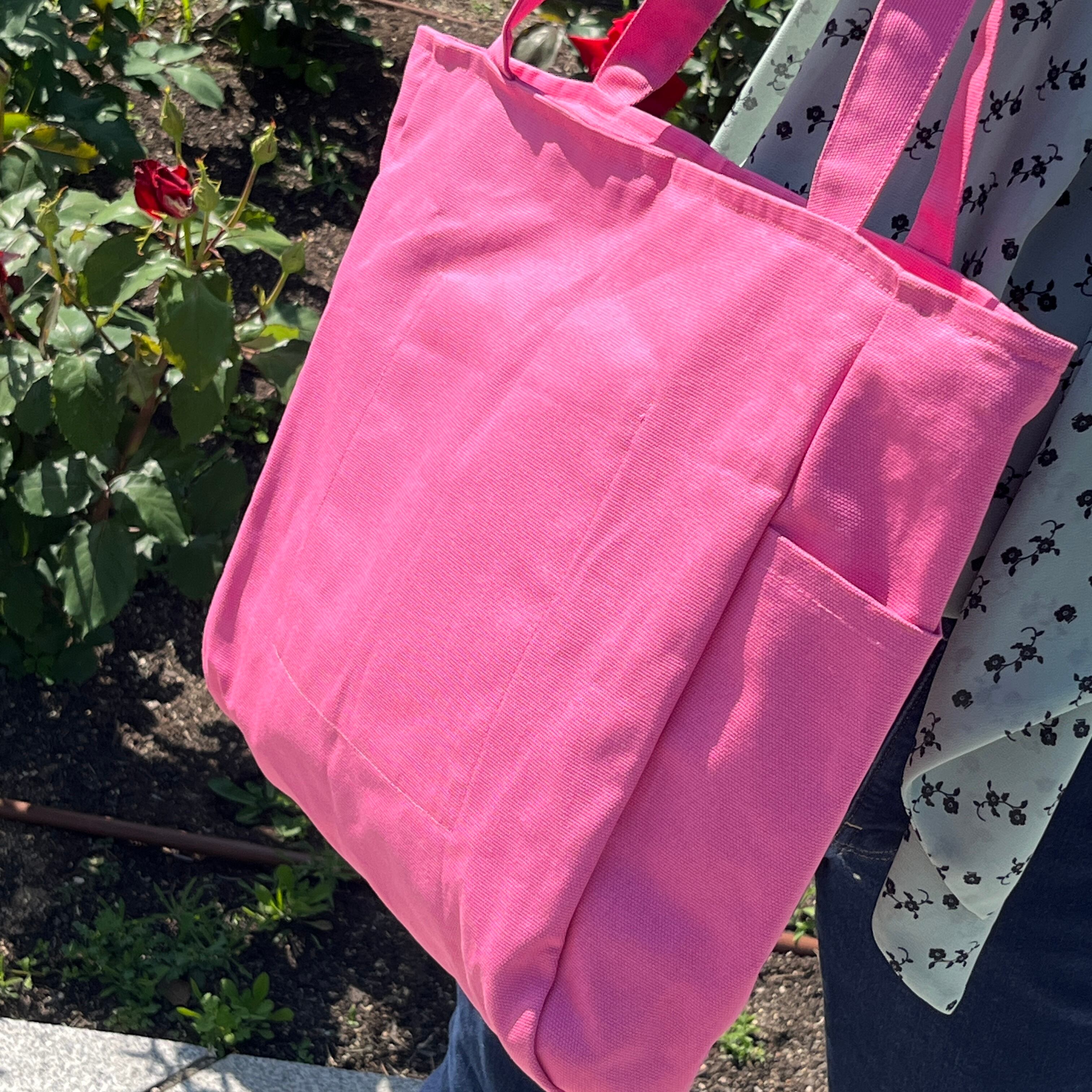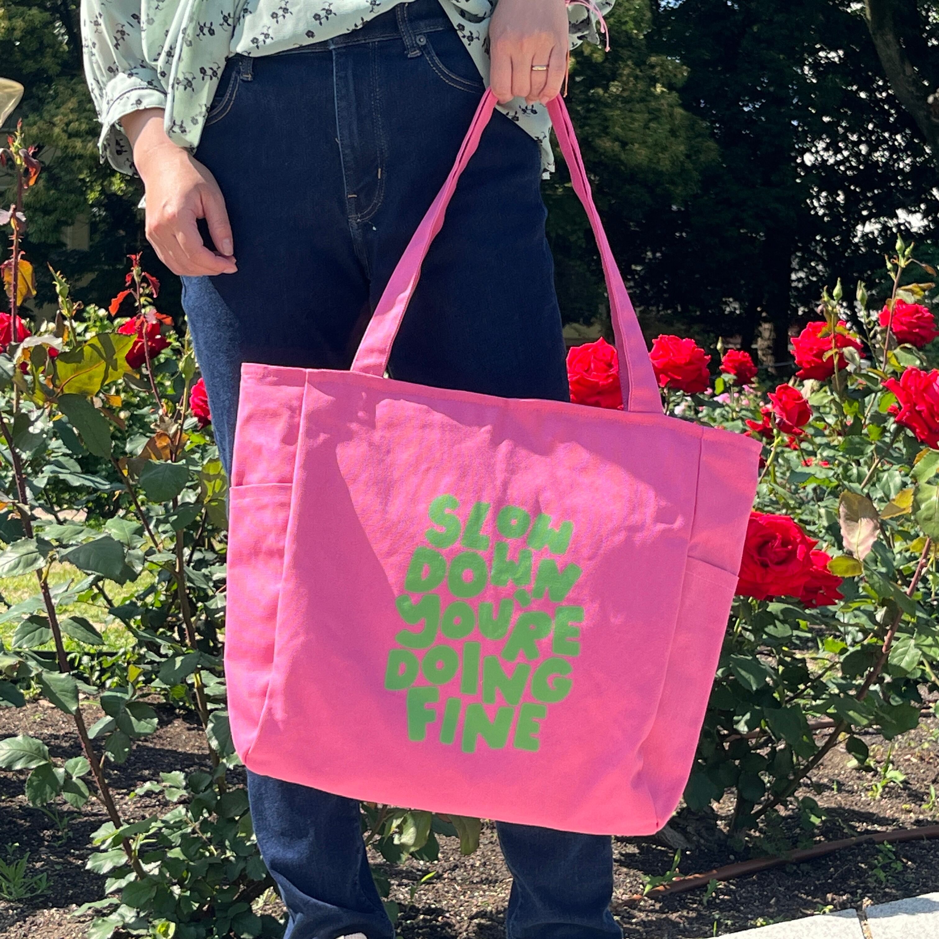明るいピンクとグリーンのロゴが目を引くキャンバス地のトートバッグです。