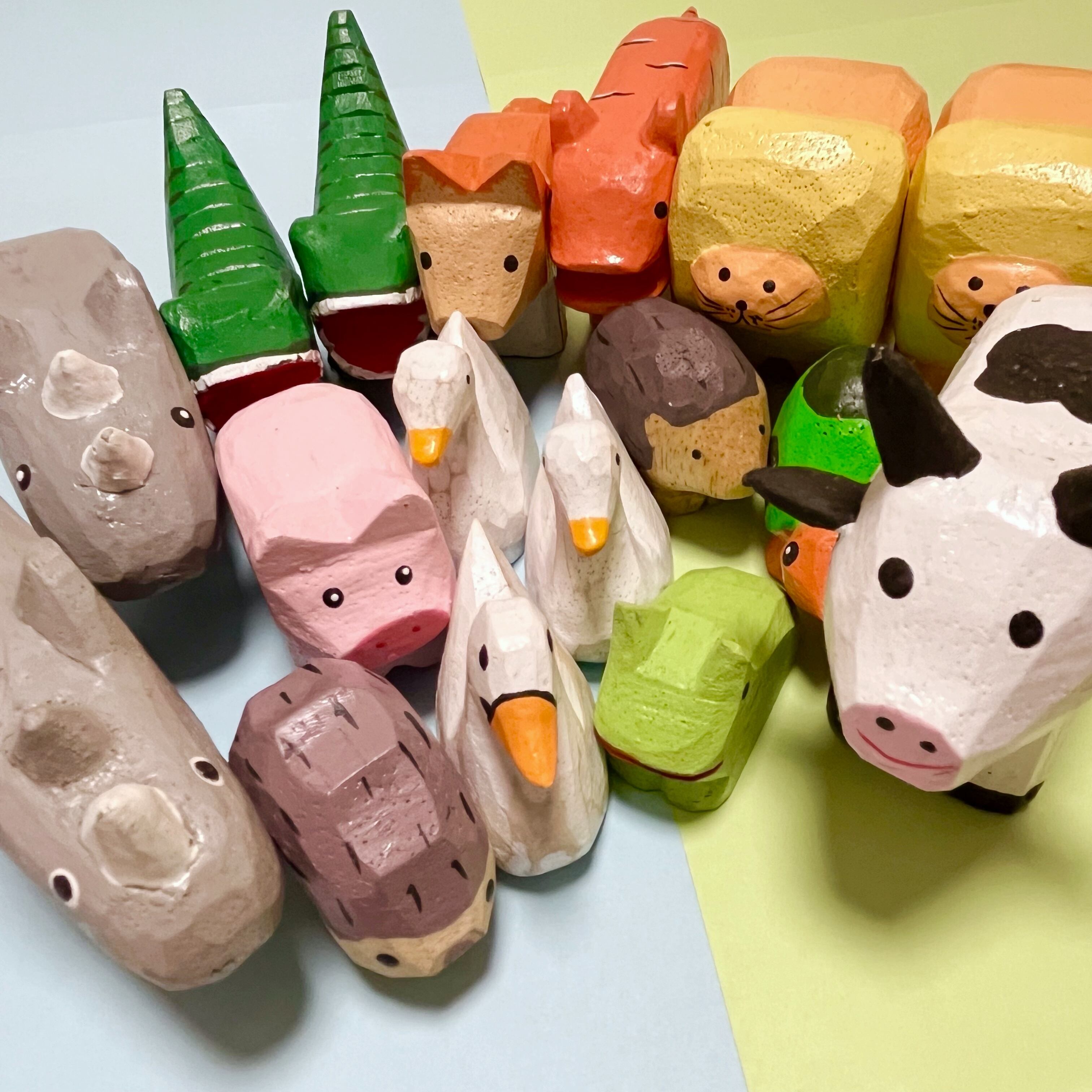 種類豊富な木彫りの動物の置物。