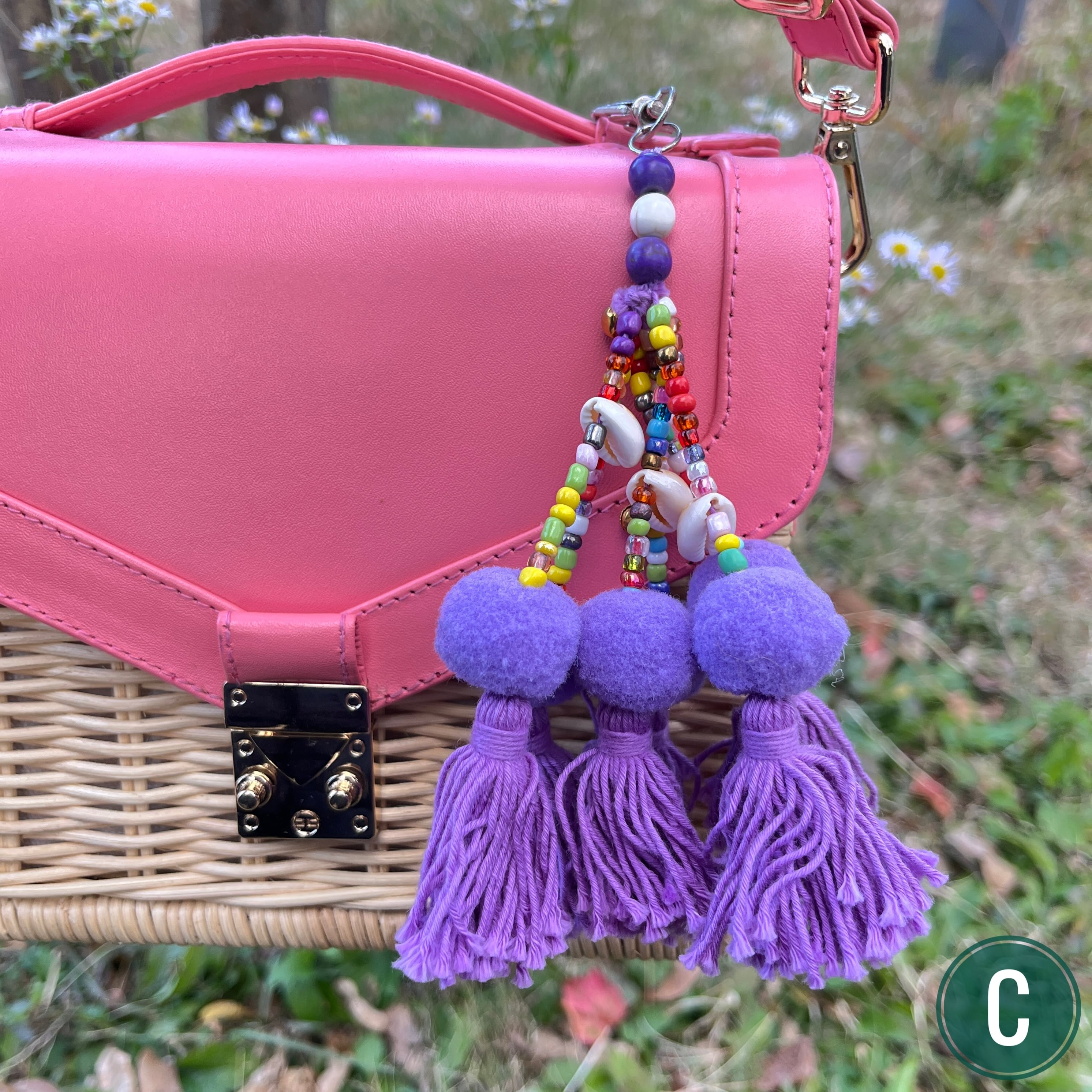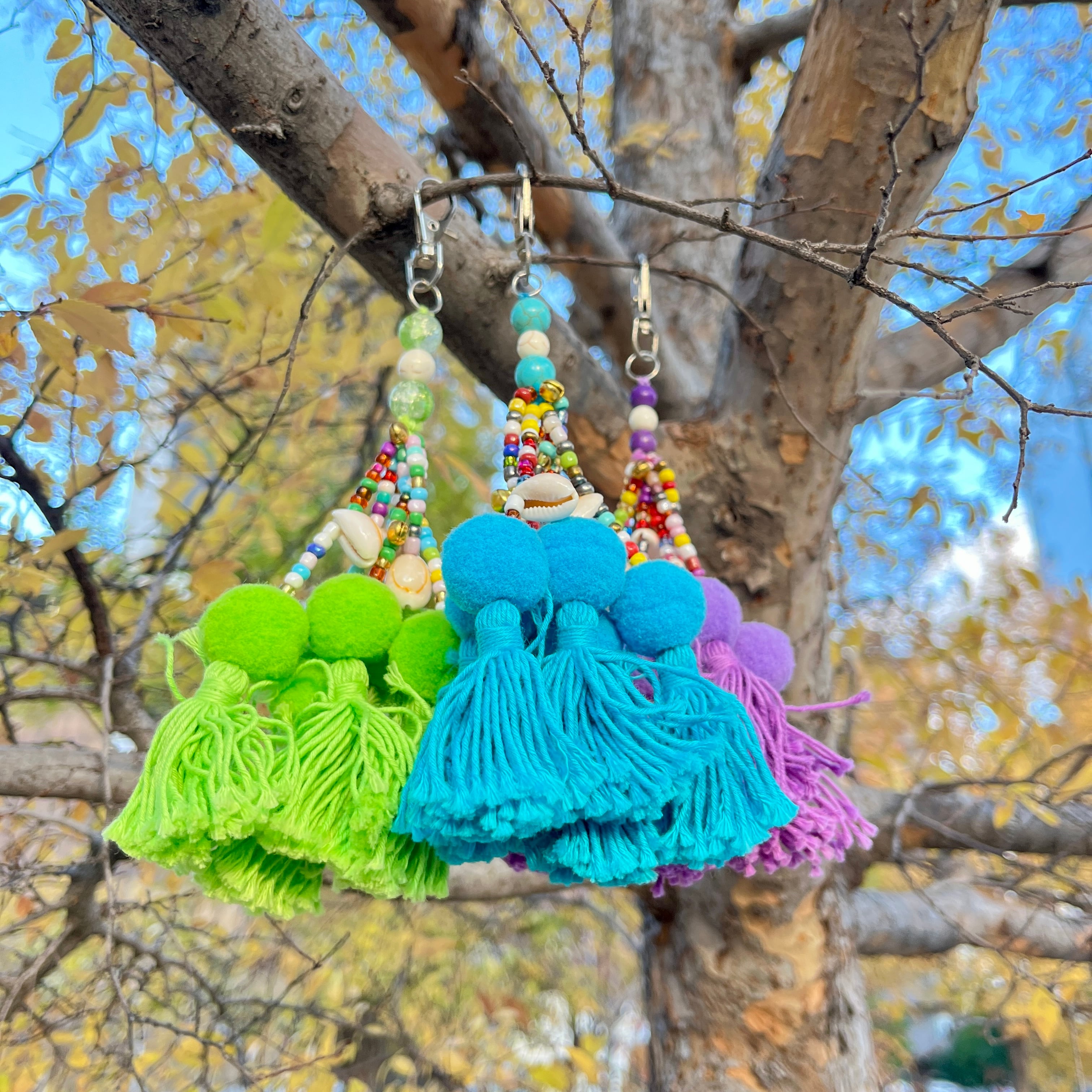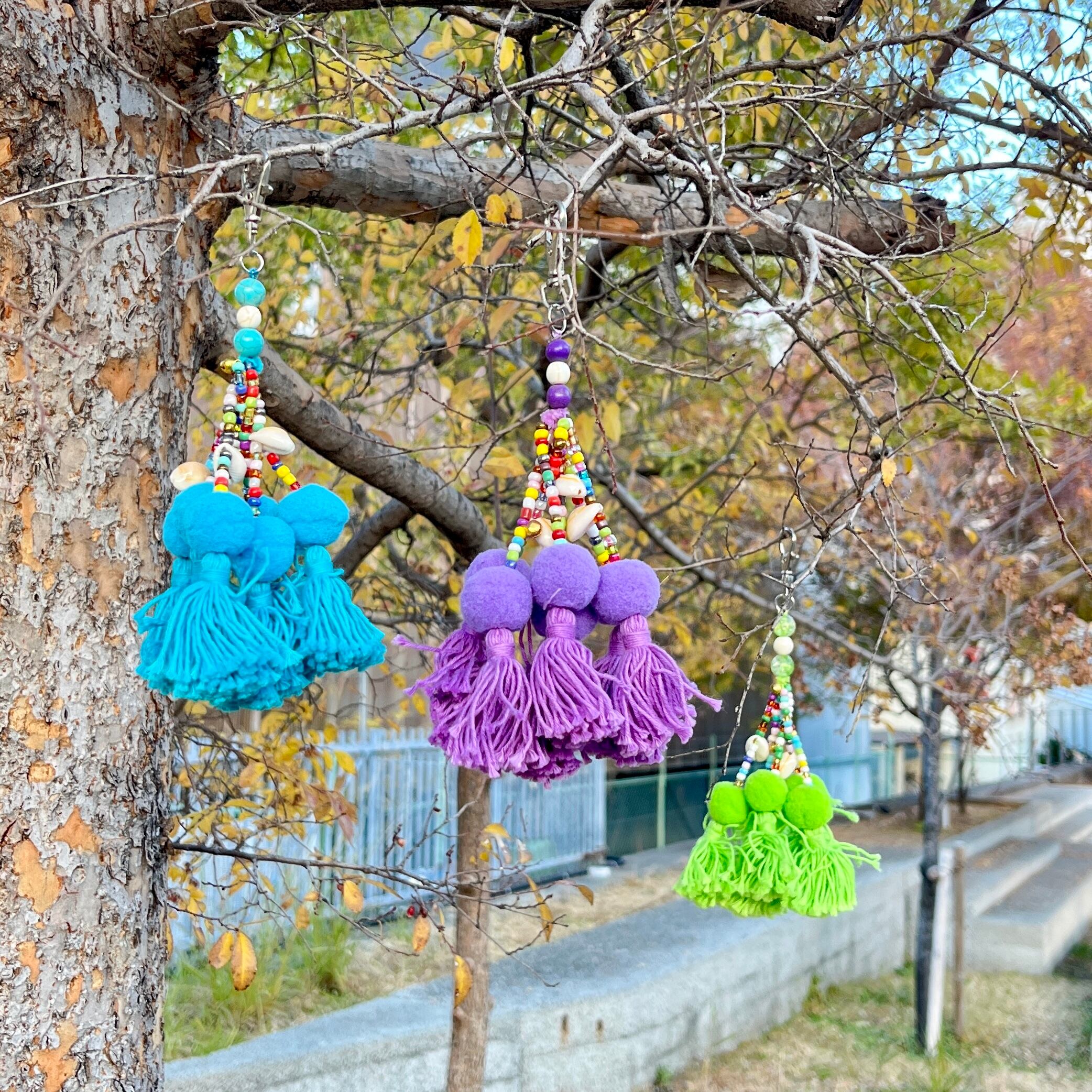 まんまるのボンボンにカラフルなビーズ、シェルの飾りがかわいいボリューム感あるキーホルダー