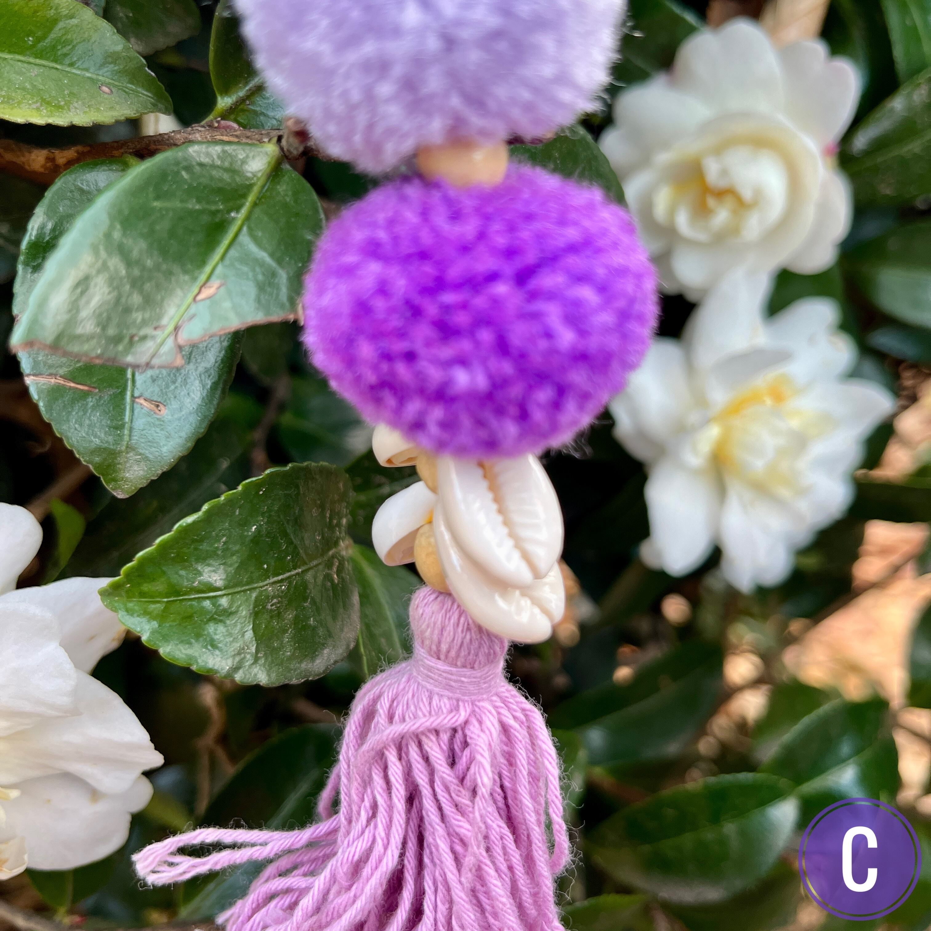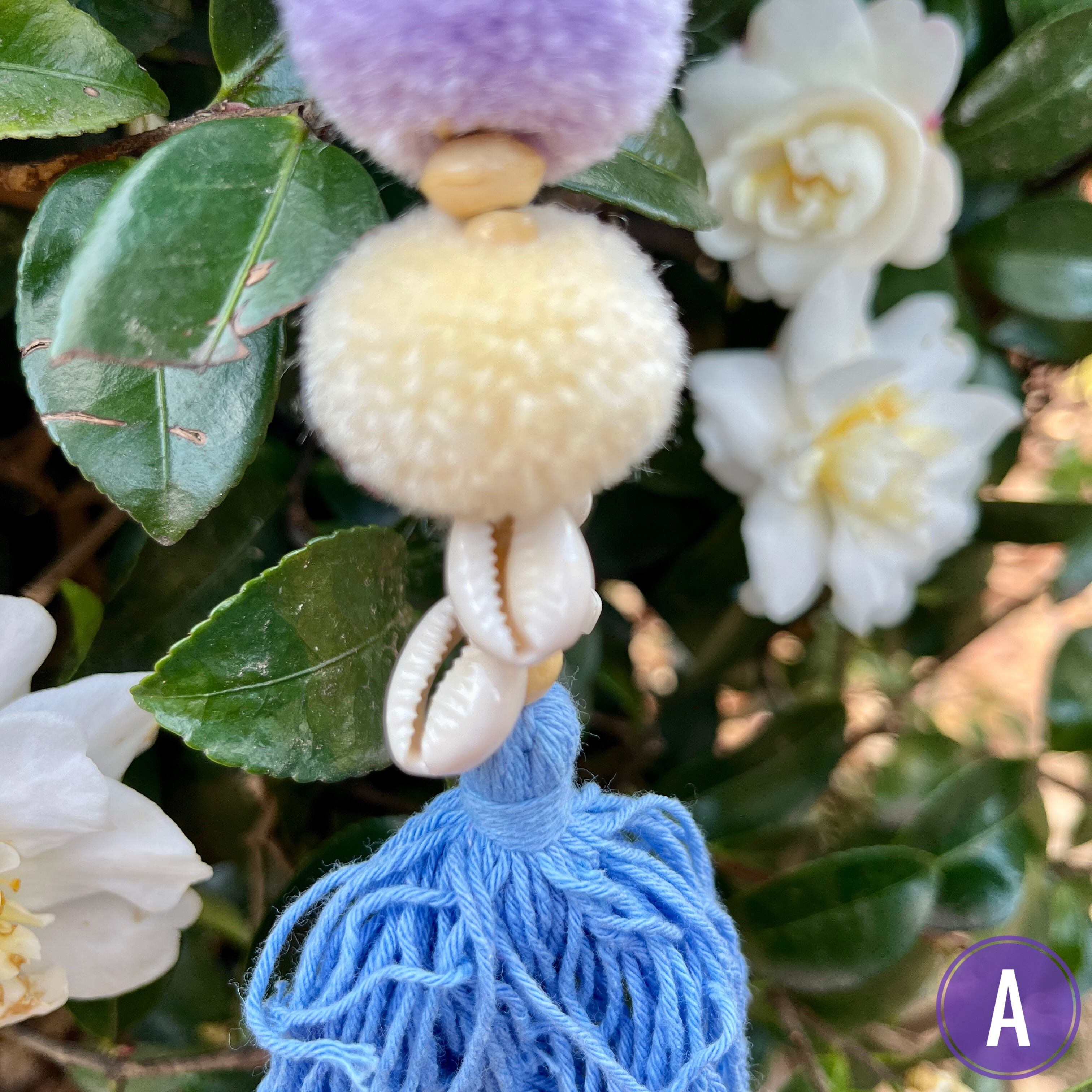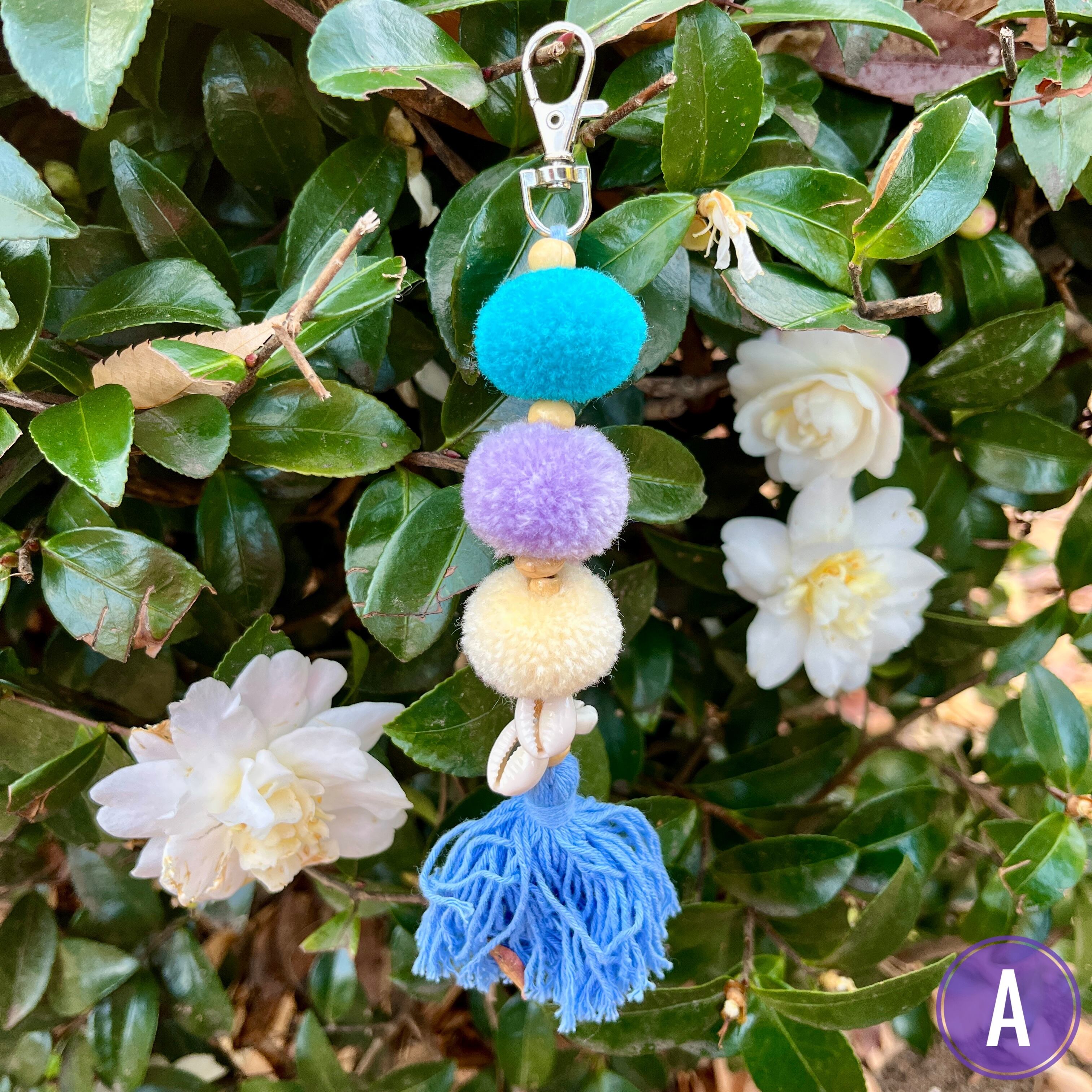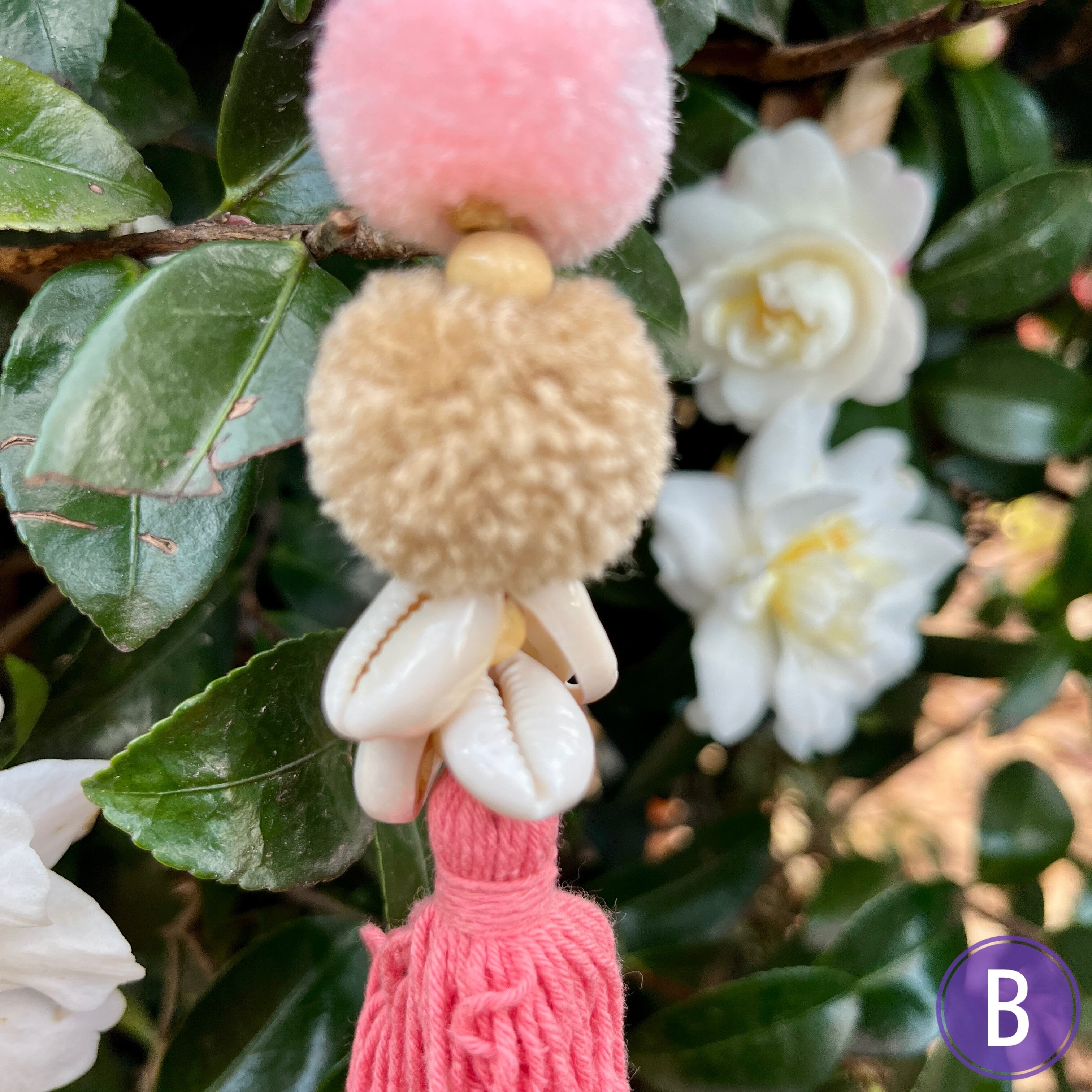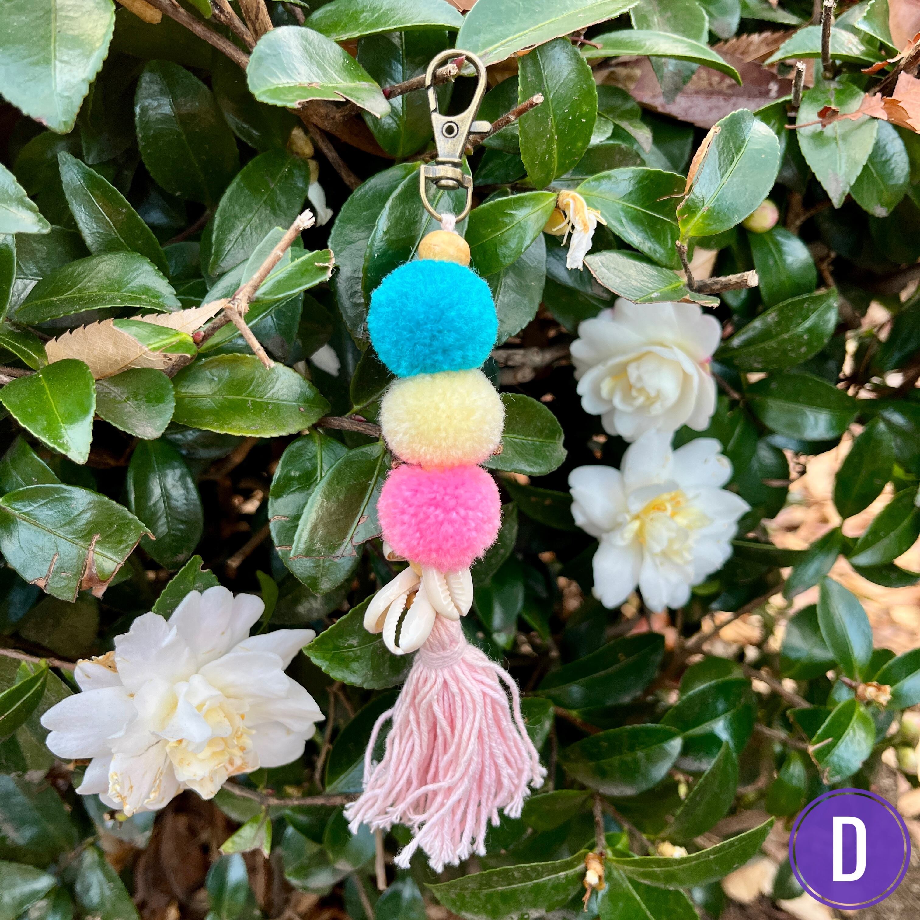 3つ連なったお団子のようなボンボンにシェルの飾りがかわいいカラフルでポップなキーホルダー